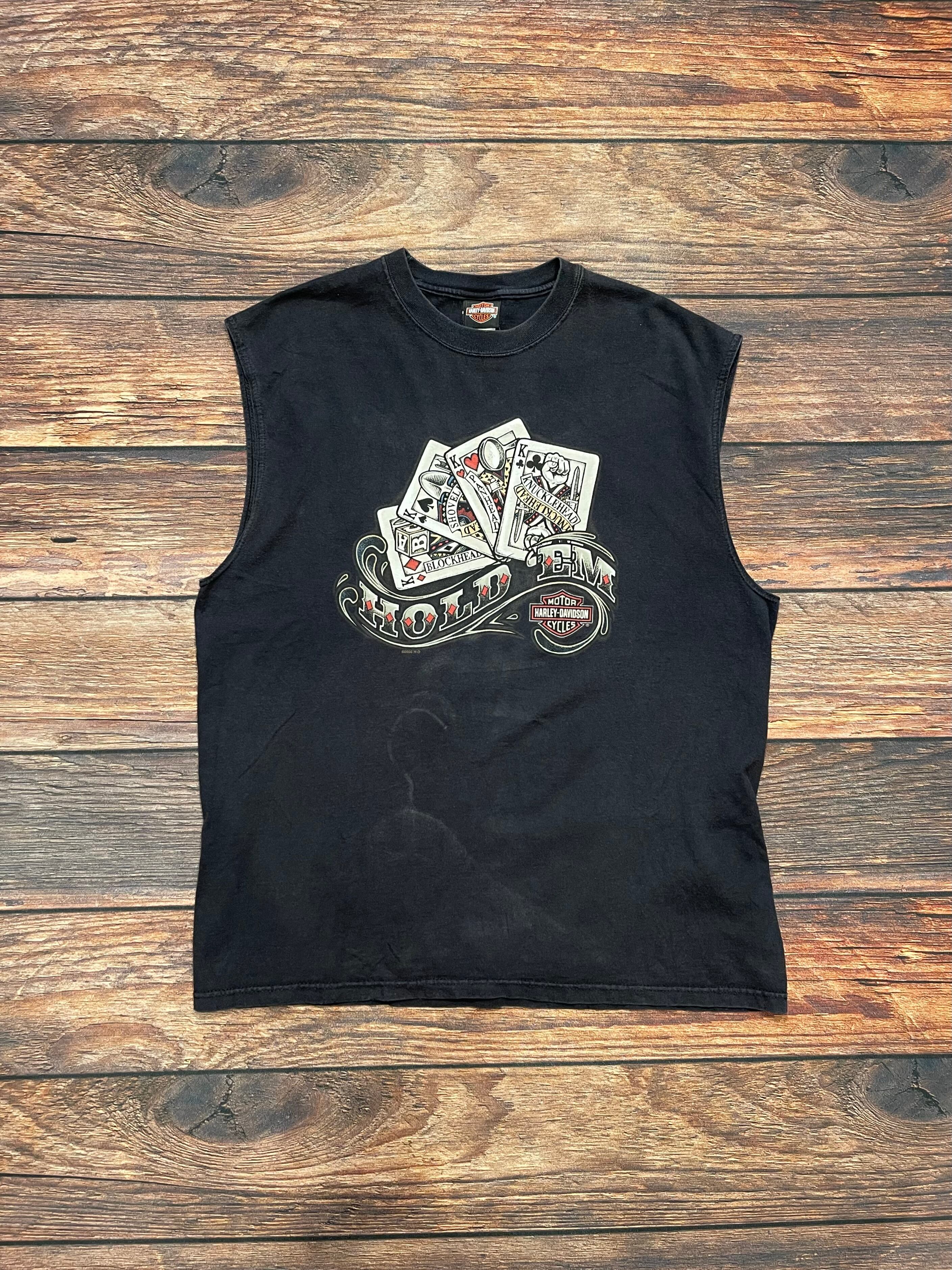 USA製のハーレータンクトップ。トランプとバイクにレーシングカーと両面てんこ盛りなプリント。