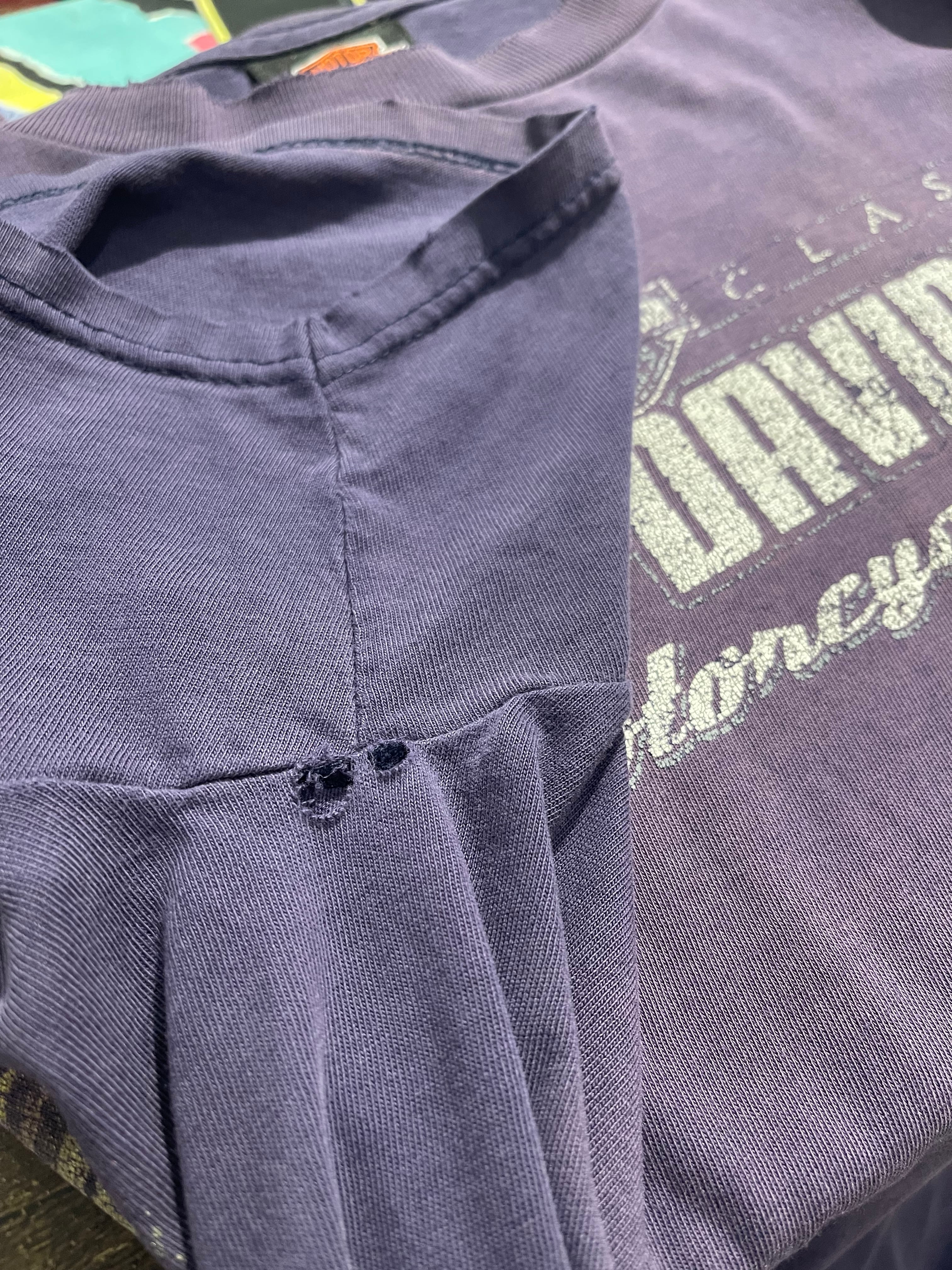 綺麗なナス紺色のハーレーT。特に背面プリントの夕焼けに輝く山のプリントカラーとナス紺色が最高にマッチした色合いでかなり好きです。