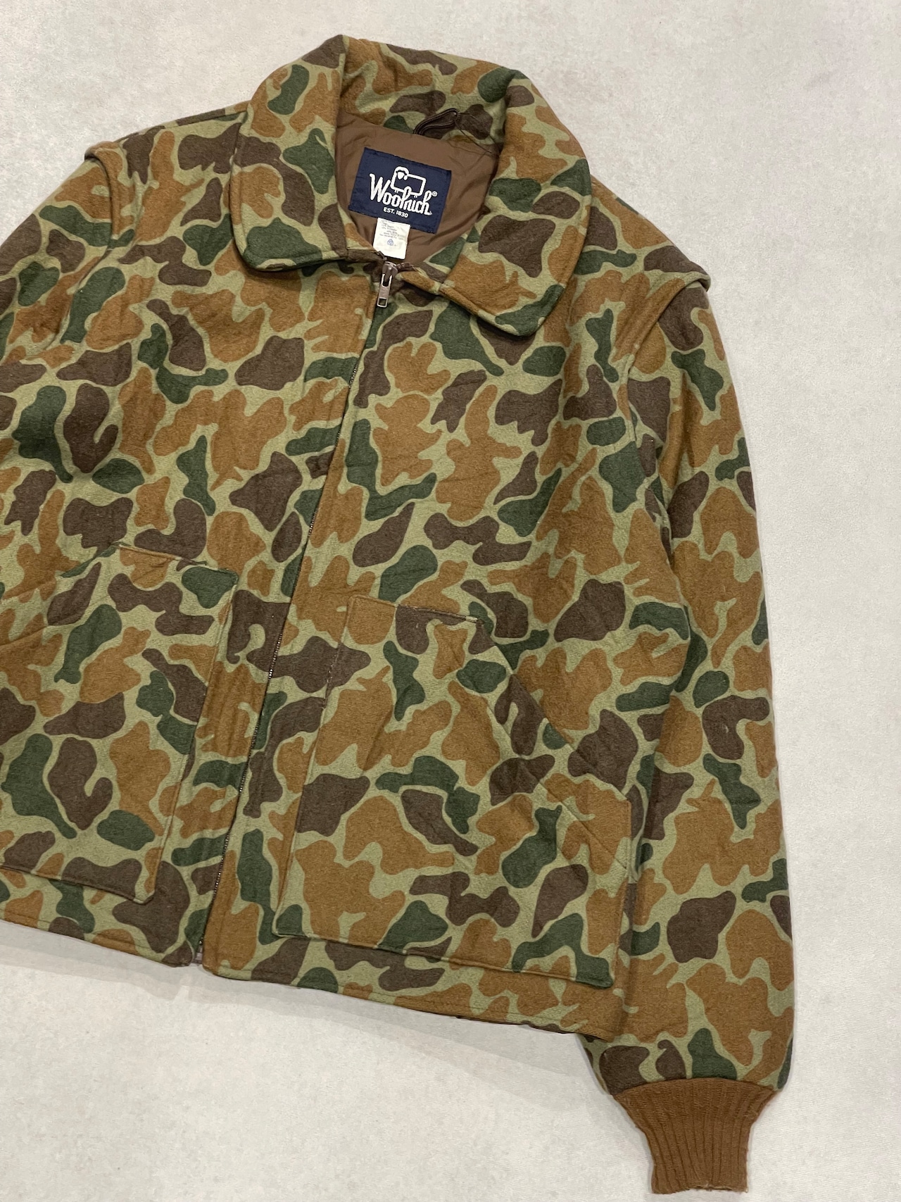 短丈なウールリッチのダックハンターカモ柄ジャケット。ウールジャケットでこの丈感は中々見当たらないサイズ感。身幅ひしっかりあるのでインナーにスウェットやセーターもしっかり着こめるサイズ◎